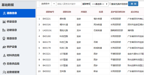 系统对道路设施管养数据、清扫保洁数据、绿化管养等养护数据进行实时分析,对养护基地情况和所有机械设备进行统计附照片,并按照日常养护、隧道养护、绿化保洁进行分类。关于养护从业人员情况系统也将进行详细录入,并可统计出管理人员、一线工人数量、持证养护工人数量、绿化保洁从业数量等信息。为了实现商业地图的接入和管养专题数据的融合,系统设置二维地图管理与服务。