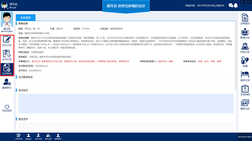 :包括病患的病历分析(主诉、病史、生命体征、临床表现、蓝颜gtv 影像、病理、蓝颜gtv 检验、手术、初步诊断、诊疗方案、用药方案)、当前疾病全息病历(当前疾病病历时间段对应的入院记录、再次入院记录、病程记录、知情同意书、护理文书)、全息疾病档案(全部疾病病历对应的入院记录、再次入院记录、病程记录、知情同意书、护理文书)、全息健康档案(病患者的生活环境、健康体检、病疗信息、预防接种、生活方式)等,系统地记录了病患者的详细信息。