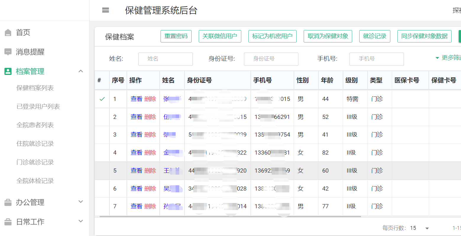 干部保健管理系统的核心内容主要包括健康体检、健康评估、健康干预三方面,医生在诊疗的时候,可以在系统上查看已有的干部健康档案,及时了解干保对象的身体状况,对身体潜在的疾病因素进行加强管理,从而有利于医护人员对干保对象进行综合评估,并采取相应的治疗措施,为干保对象提供详细的诊疗建议。