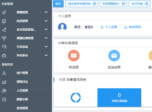 传统的科研管理模式,难以解决手动录入科研资料、数据查询统计耗时大、课题项目经费超支等弊端,面向医生、科研工作者、财务等使用者建立科研信息化办事平台,能够优化科研工作流程、提高科研效率,同时支撑科研、财务等部门的协作科研办公。