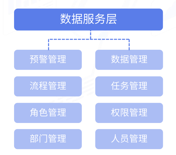 数据服务层包括:预警管理、数据管理、流程管理、任务管理、角色管理、权限管理、部门管理、人员管理等。