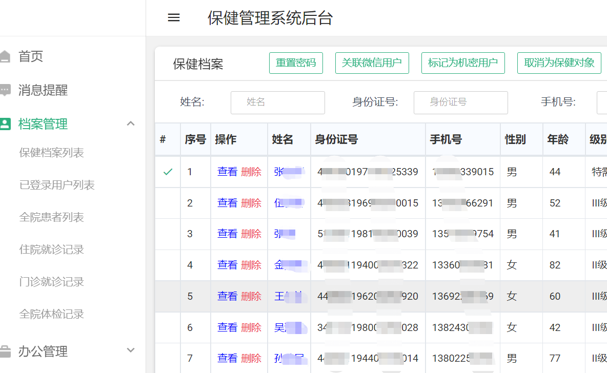 ①基本信息,保健对象个人信息包含:姓名、性别、年龄、身份证号、社保号、保健类型、单位类型、责任医生等基础信息。